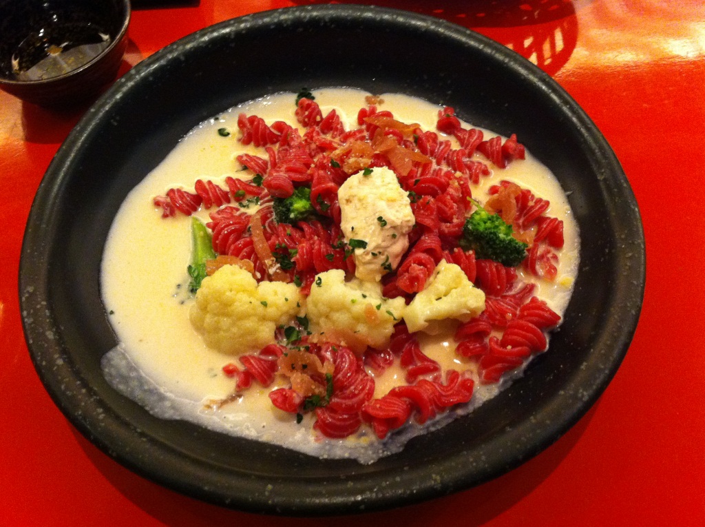 パスタに苺が練り込んであって、真っ赤ですよ