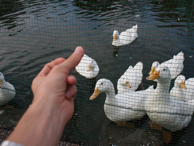 手にエサをもつと、アヒルの視線がえさに釘付けに・・・(笑