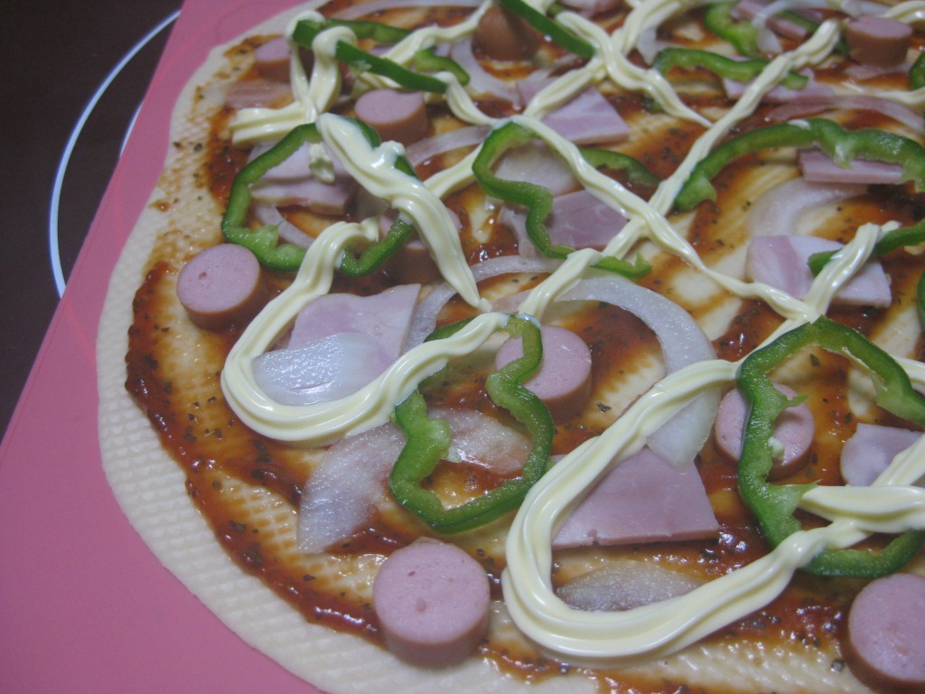 ウインナー、ベーコン、玉ねぎ、ピーマンを乗せて、上からマヨネーズを